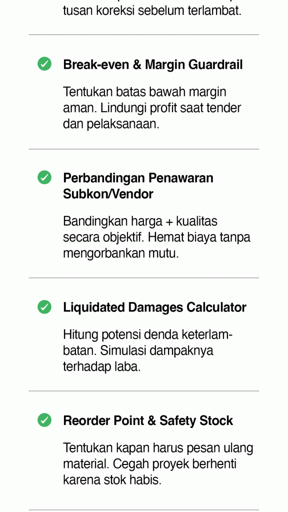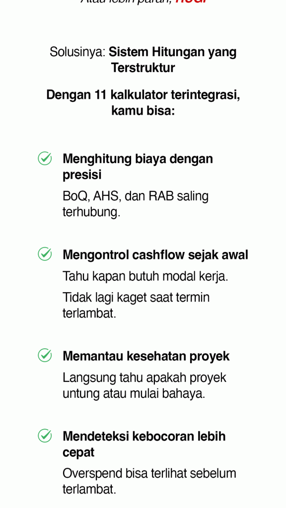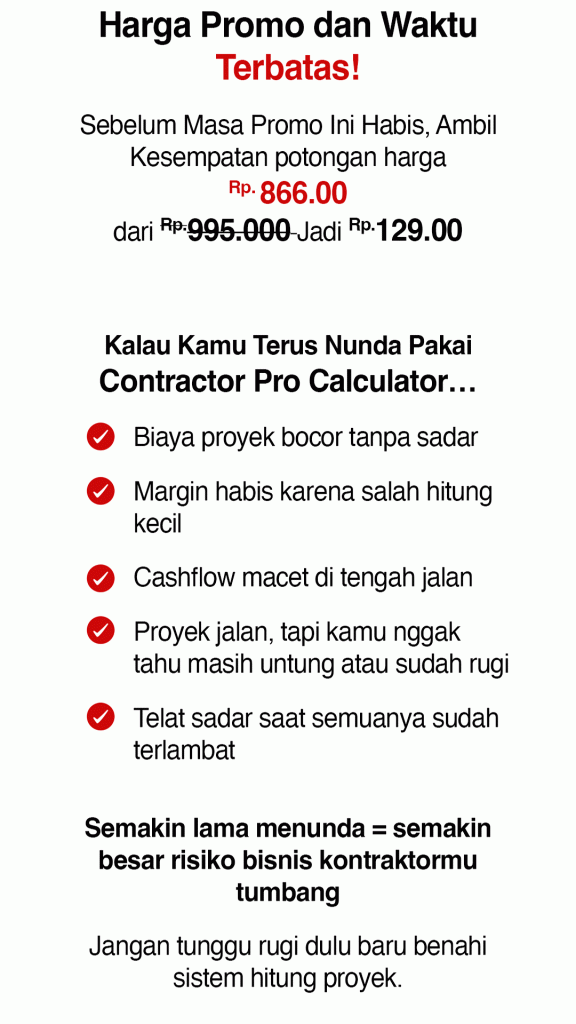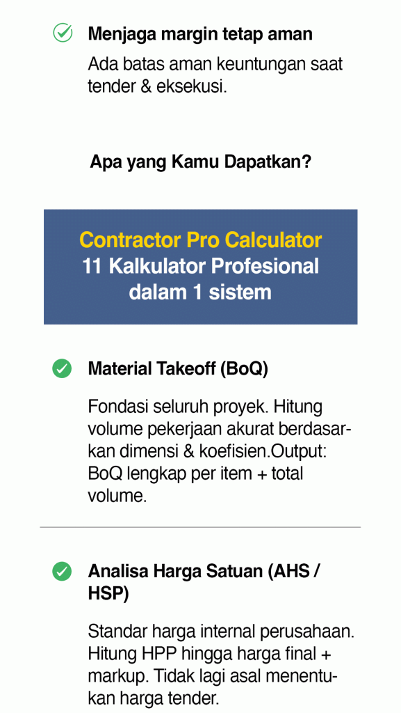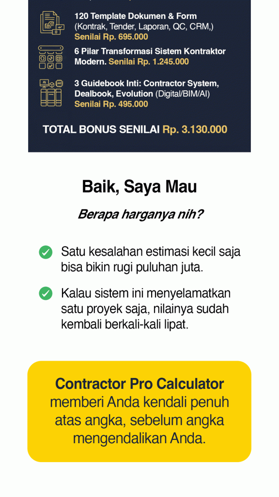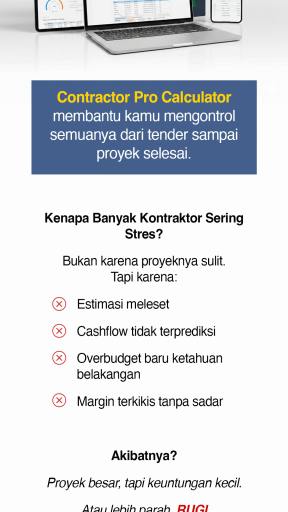 Contractor Pro Calculator adalah paket 11 kalkulator proyek profesional yang dirancang untuk kontraktor modern. Produk ini membantu Anda menghitung, memantau, dan mengelola proyek secara lebih rapi, terukur, dan menguntungkan, mulai dari tender hingga evaluasi akhir.