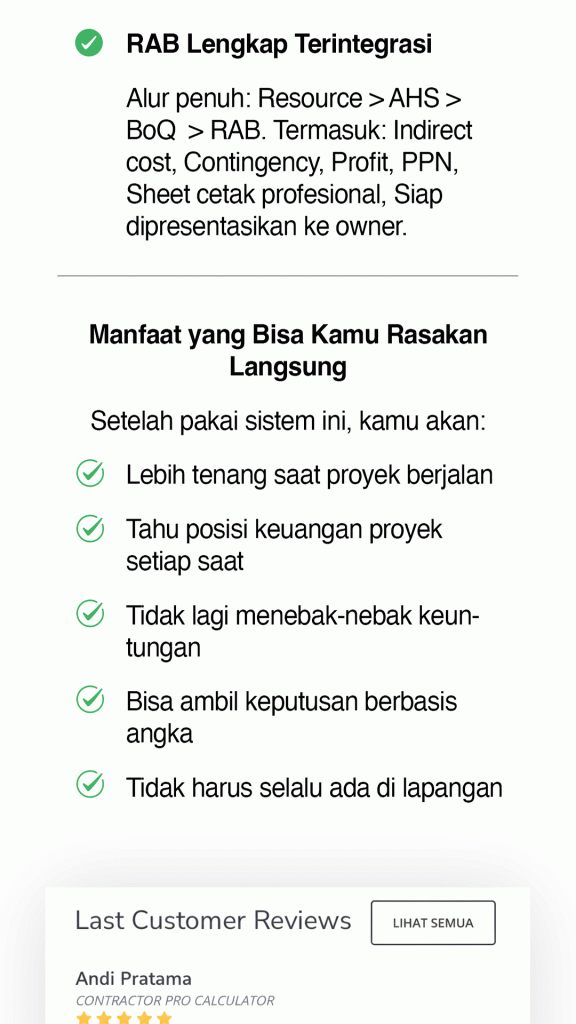 Anda cukup membuka filedi komputer atau perangkat yang kompatibel. Semua kalkulator sudah siap pakai dengan panduan step-by-step sehingga Anda bisa langsung menghitung RAB, membuat dokumen penawaran, dan mengelola proyek tanpa harus membuat dari awal.